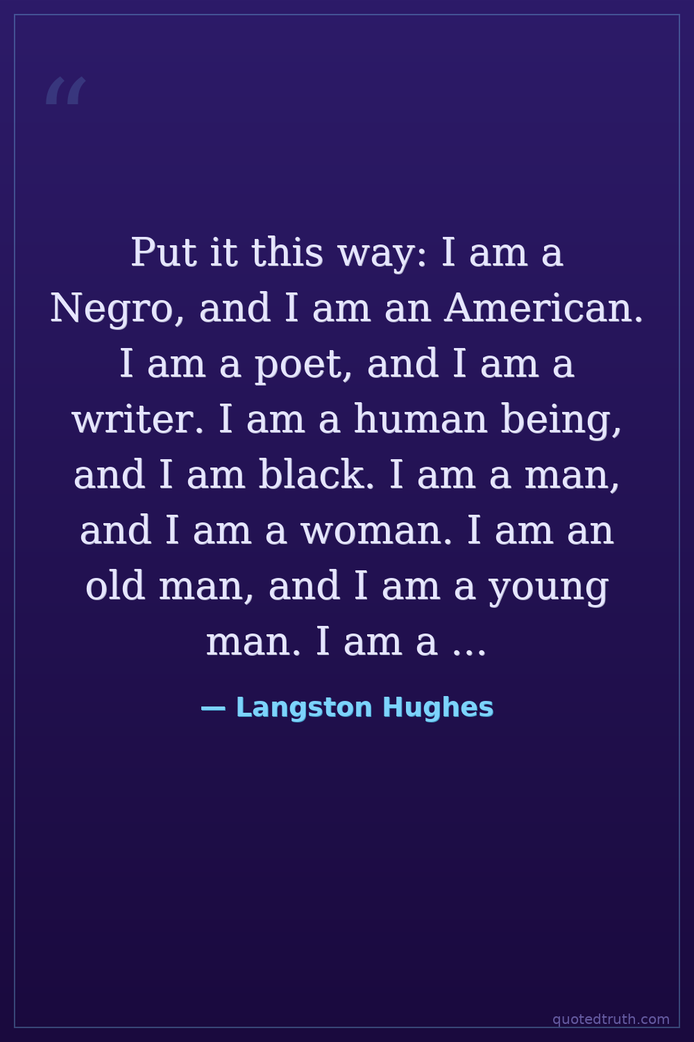Put it this way: I am a Negro, and I am an American. I am a poet, and I am a writer. I am a human being, and I am black. I am a man, and I am a woman. I am an old man, and I am a young man. I am a child, and I am an adult. I am a fool, and I am a wise man. I am a saint, and I am a sinner.
