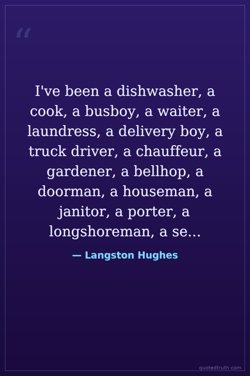 I've been a dishwasher, a cook, a busboy, a waiter, a laundress, a delivery boy, a truck driver, a chauffeur, a gardener, a bellhop, a doorman, a houseman, a janitor, a porter, a longshoreman, a seaman, a coal miner, a steel worker, a factory hand, a farm hand, a construction worker, a ditch digger, a street sweeper, a garbage collector, a rag picker, a shoe shine boy, a newsboy, a messenger boy, a telegraph boy, a stable boy, a jockey, a boxer, a wrestler, a dancer, a singer, a musician, an actor, a comedian, a storyteller, a lecturer, a journalist, an editor, a publisher, a librarian, a teacher, a social worker, a lawyer, a doctor, a minister, a politician, a revolutionary, a philosopher, a scientist, an inventor, an artist, a writer, a poet.