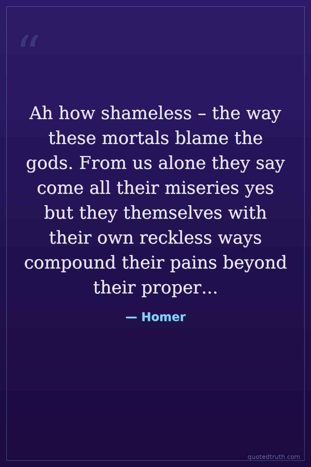 Ah how shameless – the way these mortals blame the gods. From us alone they say come all their miseries yes but they themselves with their own reckless ways compound their pains beyond their proper share.