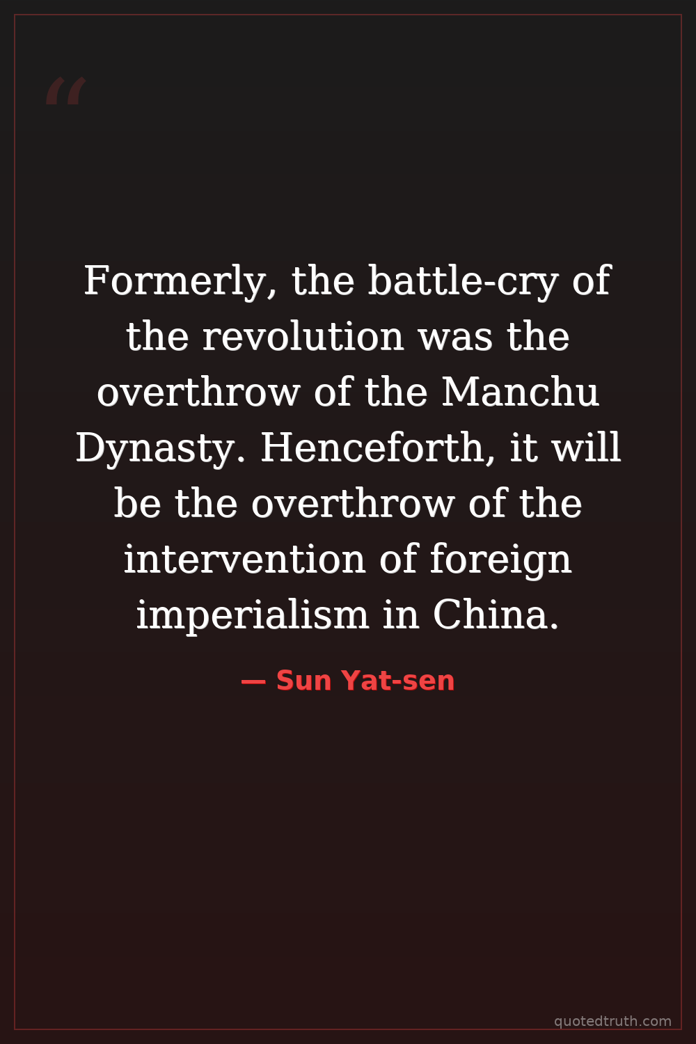 Formerly, the battle-cry of the revolution was the overthrow of the Manchu Dynasty. Henceforth, it will be the overthrow of the intervention of foreign imperialism in China.
