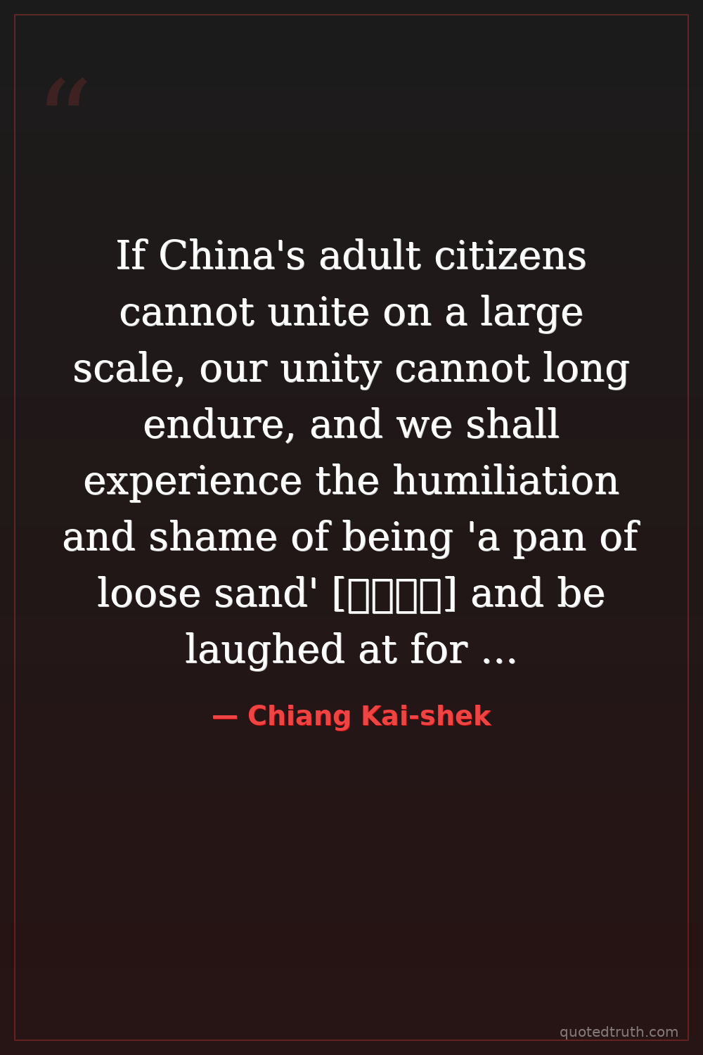 If China's adult citizens cannot unite on a large scale, our unity cannot long endure, and we shall experience the humiliation and shame of being 'a pan of loose sand' [一盤散沙] and be laughed at for our 'five minutes of boiling blood' [五分鐘的熱血].