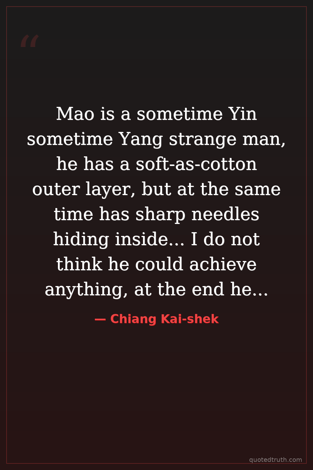 Mao is a sometime Yin sometime Yang strange man, he has a soft-as-cotton outer layer, but at the same time has sharp needles hiding inside... I do not think he could achieve anything, at the end he will be crushed inside my palm.