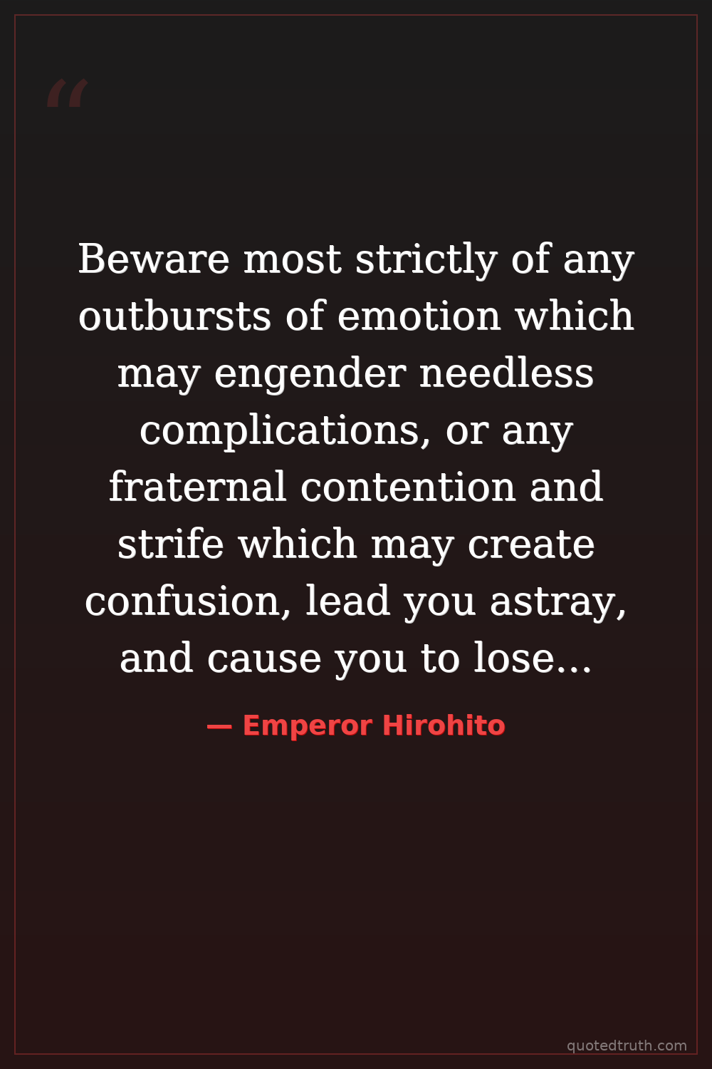 Beware most strictly of any outbursts of emotion which may engender needless complications, or any fraternal contention and strife which may create confusion, lead you astray, and cause you to lose the confidence of the world.
