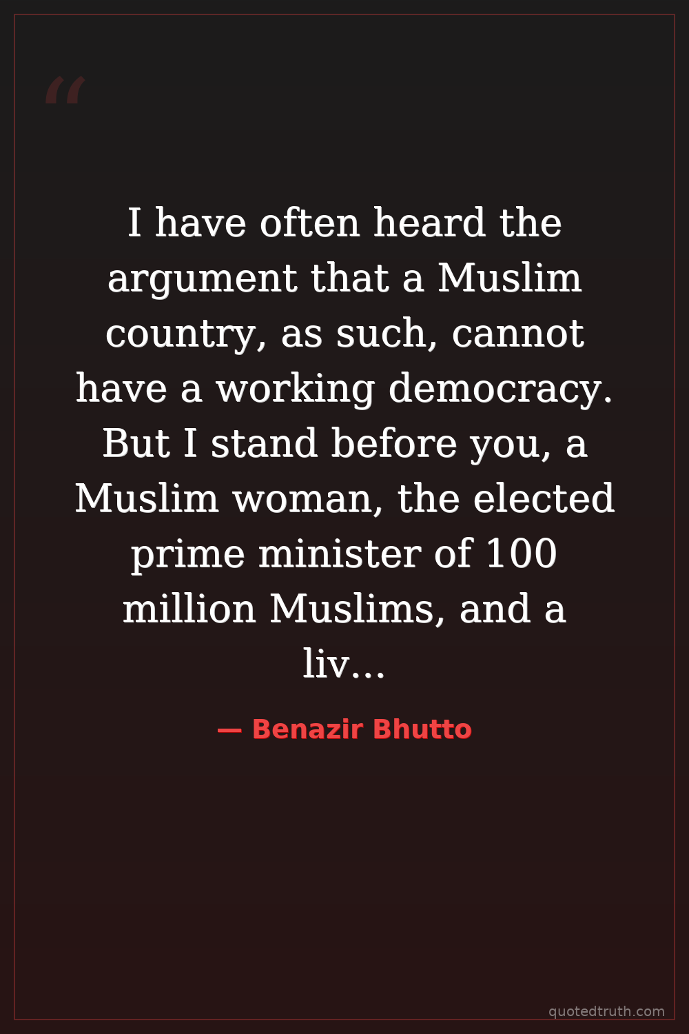 I have often heard the argument that a Muslim country, as such, cannot have a working democracy. But I stand before you, a Muslim woman, the elected prime minister of 100 million Muslims, and a living refutation of such arguments and notions.