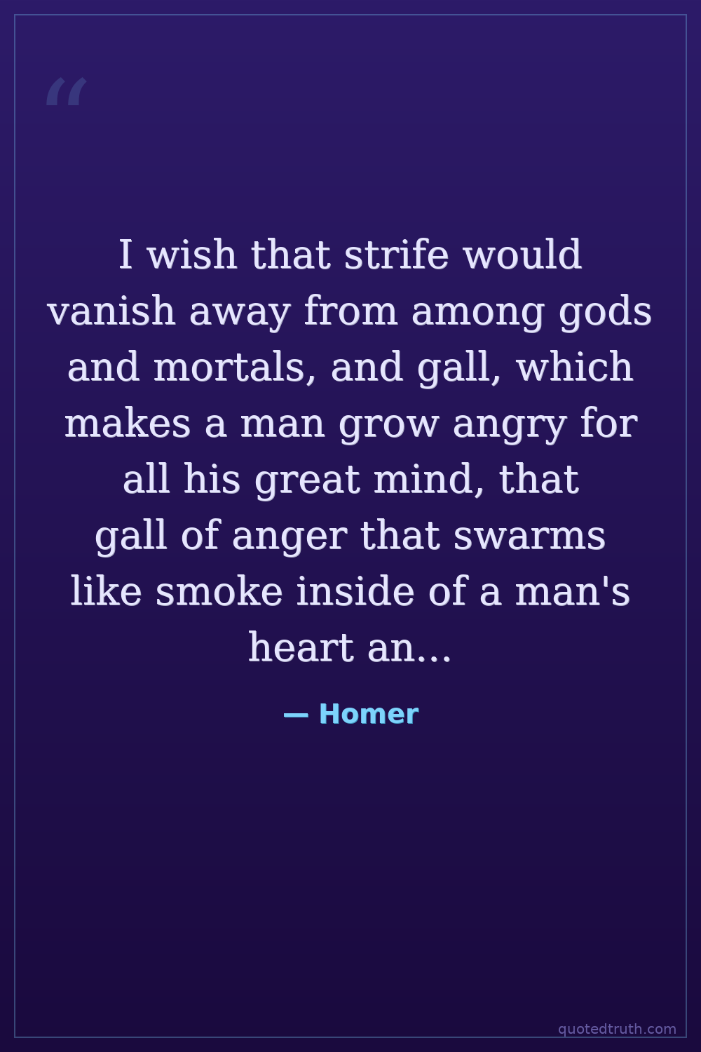 I wish that strife would vanish away from among gods and mortals, and gall, which makes a man grow angry for all his great mind, that gall of anger that swarms like smoke inside of a man's heart and becomes a thing sweeter to him by far than the dripping of honey.