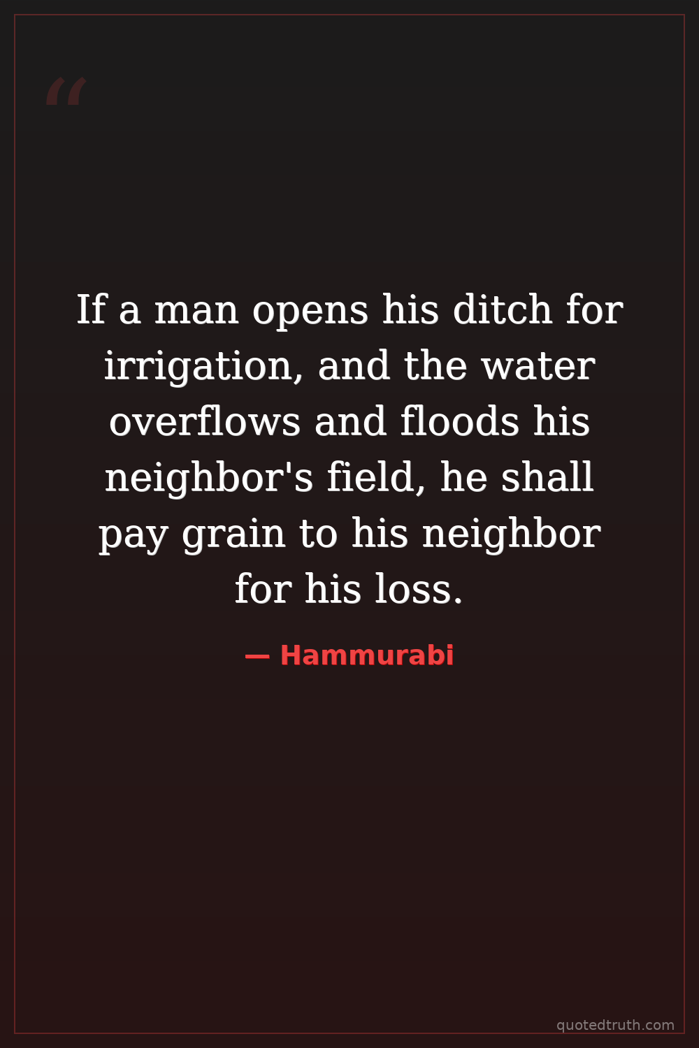 If a man opens his ditch for irrigation, and the water overflows and floods his neighbor's field, he shall pay grain to his neighbor for his loss.