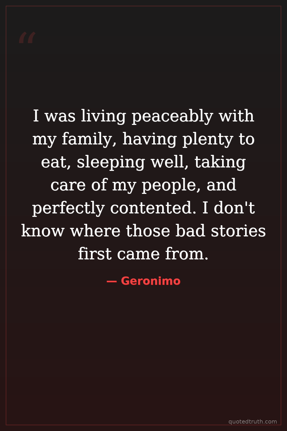 I was living peaceably with my family, having plenty to eat, sleeping well, taking care of my people, and perfectly contented. I don't know where those bad stories first came from.
