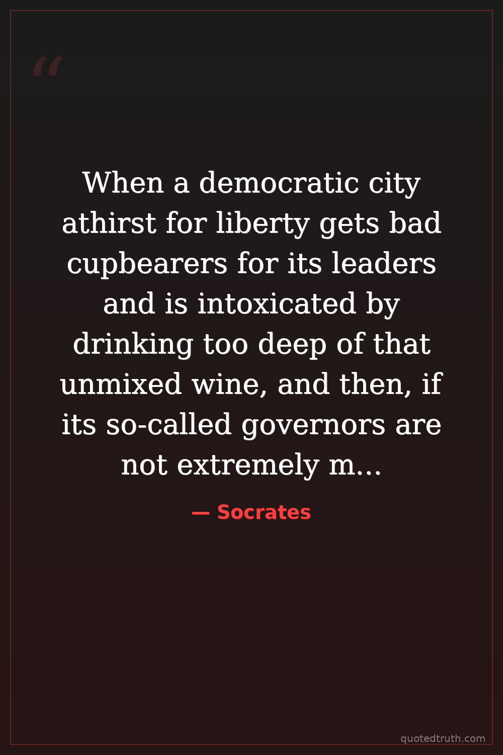 When a democratic city athirst for liberty gets bad cupbearers for its leaders and is intoxicated by drinking too deep of that unmixed wine, and then, if its so-called governors are not extremely mild and gentle with it and do not dispense the liberty unstintedly, it chastises them and accuses them of being accursed oligarchs.
