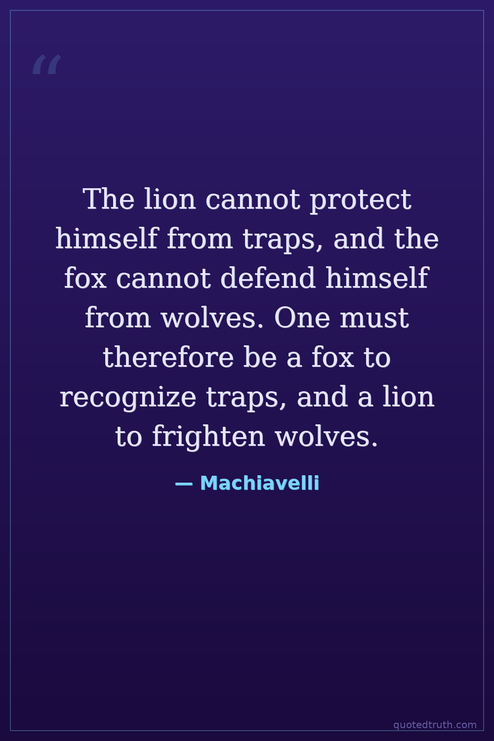 The lion cannot protect himself from traps, and the fox cannot defend himself from wolves. One must therefore be a fox to recognize traps, and a lion to frighten wolves.
