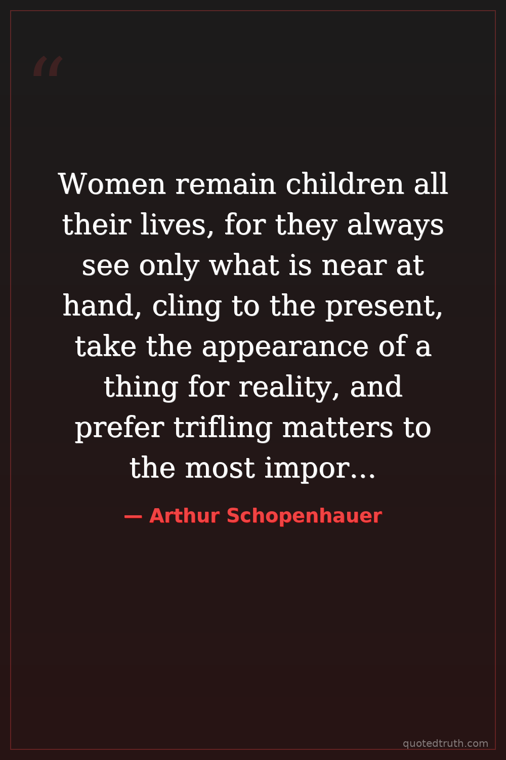 Women remain children all their lives, for they always see only what is near at hand, cling to the present, take the appearance of a thing for reality, and prefer trifling matters to the most important.