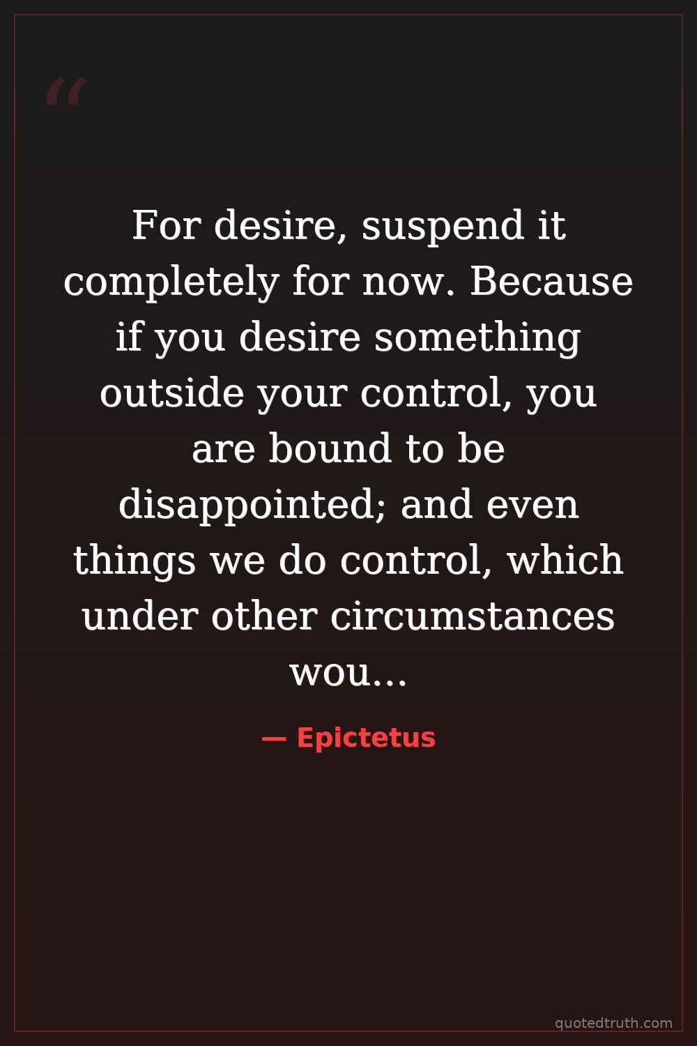 For desire, suspend it completely for now. Because if you desire something outside your control, you are bound to be disappointed; and even things we do control, which under other circumstances would be deserving of our desire, are not yet within our power to attain. Restrict yourself to choice and refusal; and exercise them carefully, within discipline and detachment.