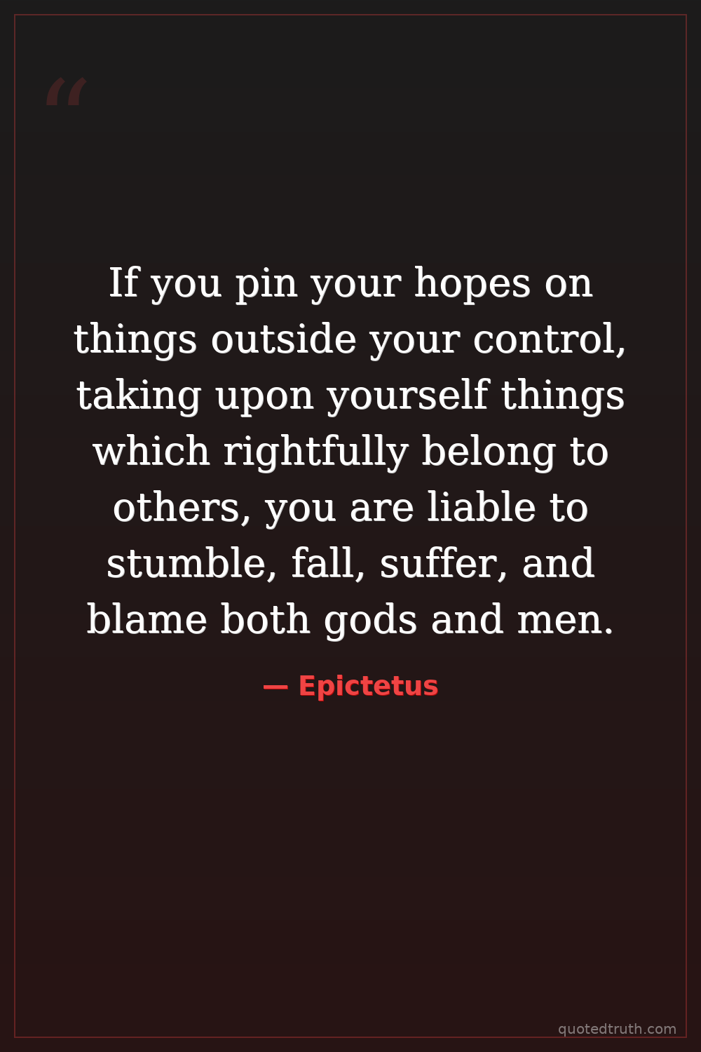 If you pin your hopes on things outside your control, taking upon yourself things which rightfully belong to others, you are liable to stumble, fall, suffer, and blame both gods and men.