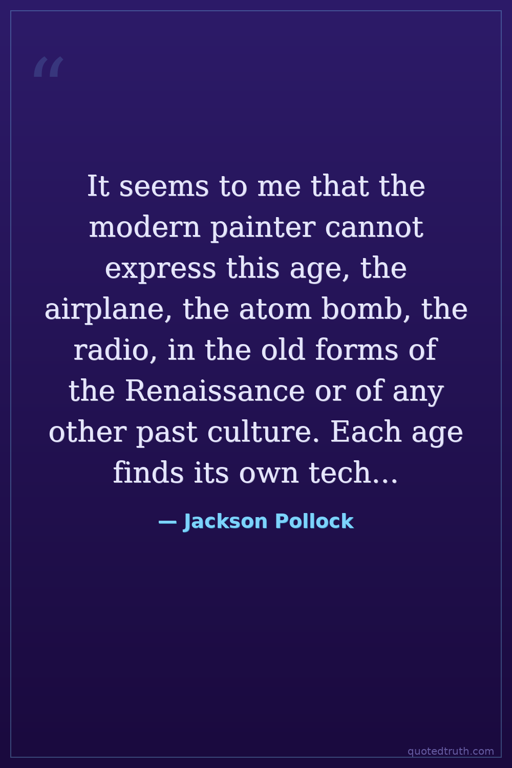 It seems to me that the modern painter cannot express this age, the airplane, the atom bomb, the radio, in the old forms of the Renaissance or of any other past culture. Each age finds its own technique.
