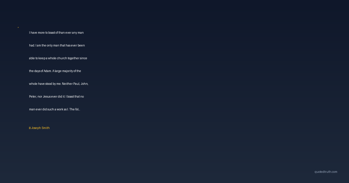 I have more to boast of than ever any man had. I am the only man that has ever been able to keep a whole church together since the days of Adam. A large majority of the whole have stood by me. Neither Paul, John, Peter, nor Jesus ever did it. I boast that no man ever did such a work as I. The followers of Jesus ran away from Him; but the Latter-day Saints never ran away from me yet.