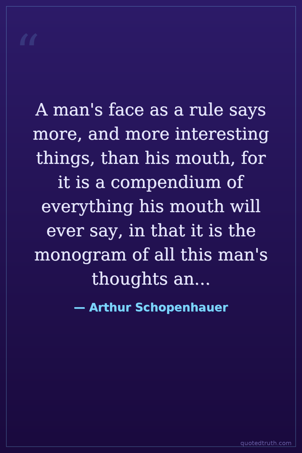A man's face as a rule says more, and more interesting things, than his mouth, for it is a compendium of everything his mouth will ever say, in that it is the monogram of all this man's thoughts and aspirations.