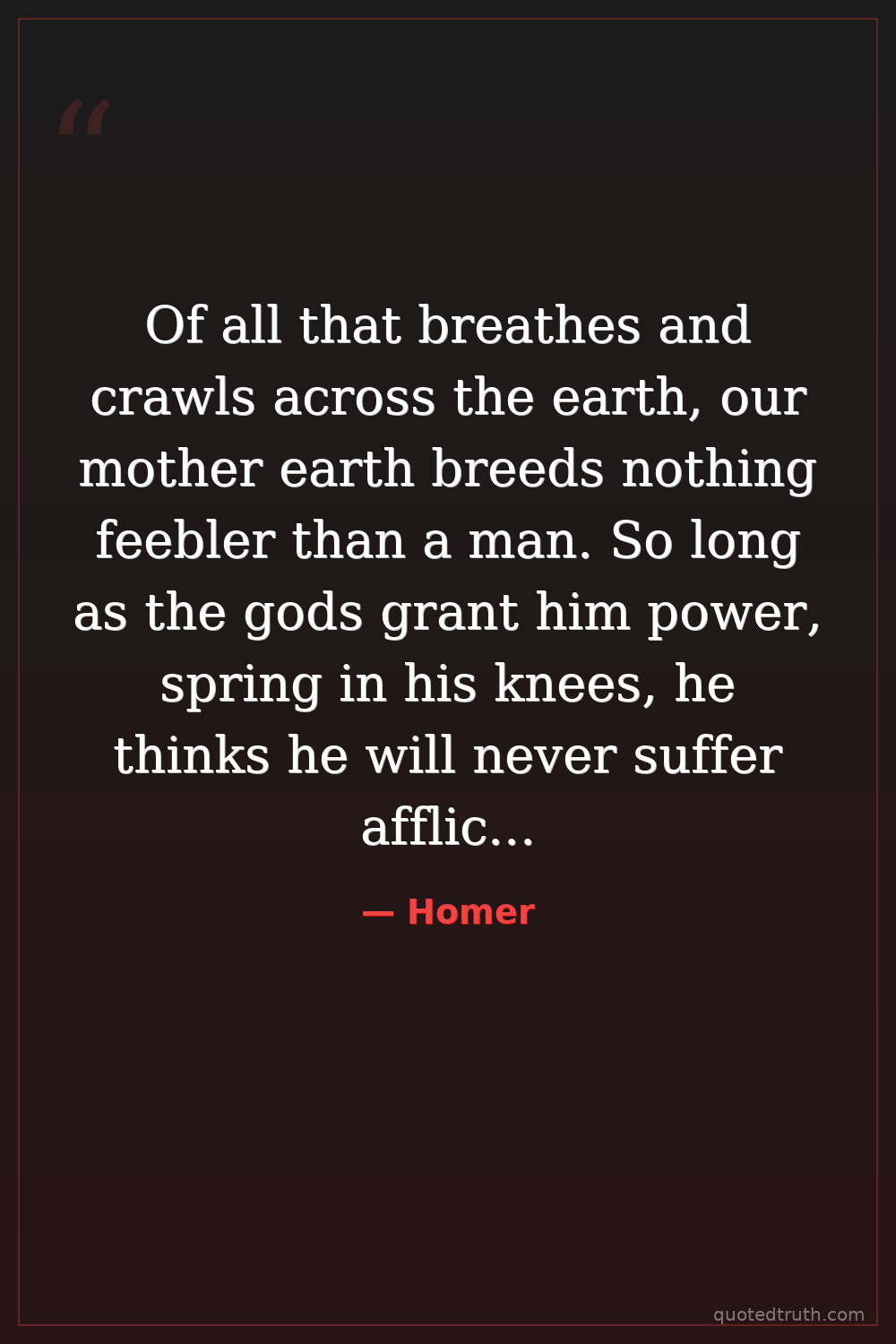 Of all that breathes and crawls across the earth, our mother earth breeds nothing feebler than a man. So long as the gods grant him power, spring in his knees, he thinks he will never suffer affliction down the years. But then, when the happy gods bring on the long hard times, bear them he must, against his will, and steel his heart.