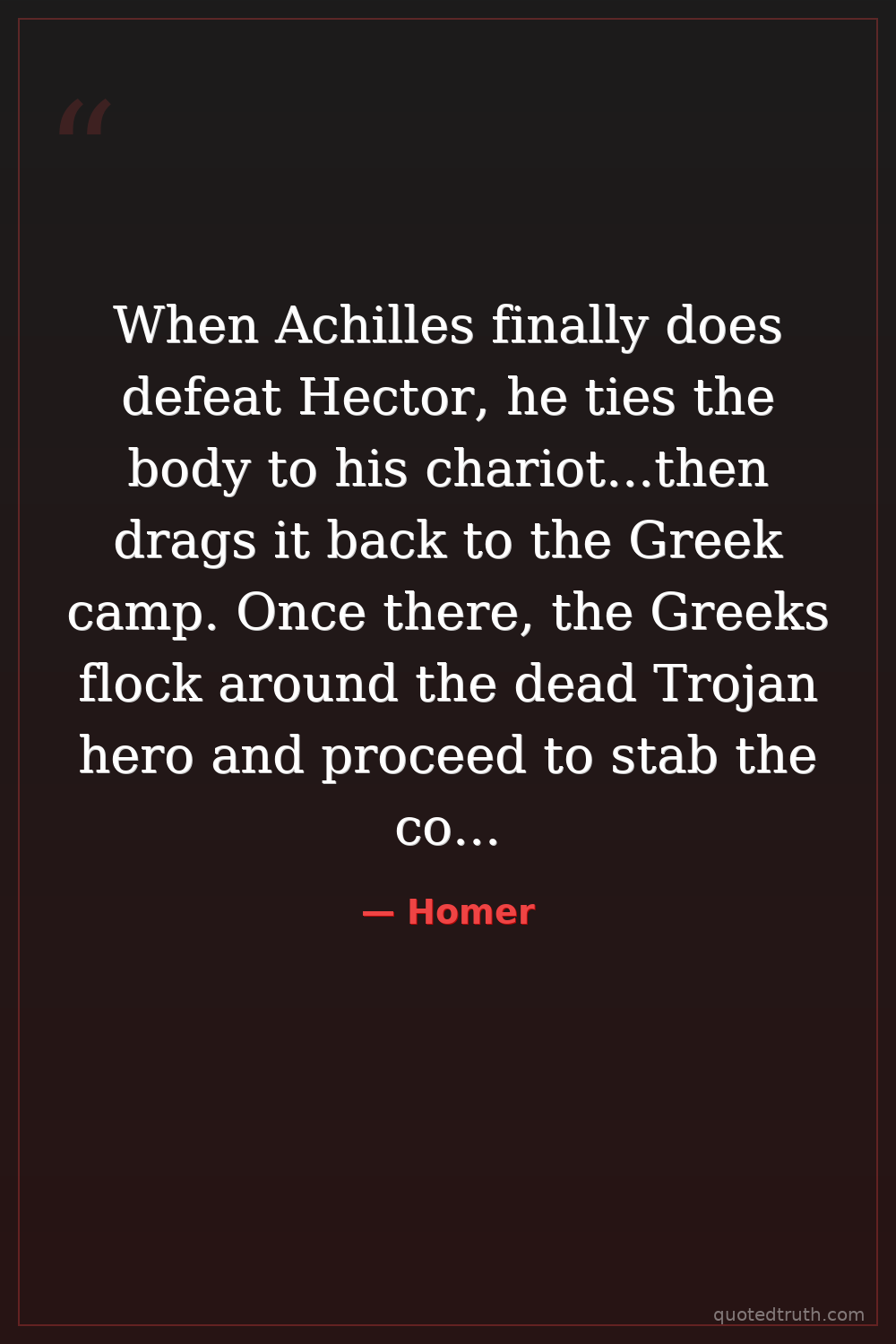 When Achilles finally does defeat Hector, he ties the body to his chariot...then drags it back to the Greek camp. Once there, the Greeks flock around the dead Trojan hero and proceed to stab the corpse and mock the dead hero, saying how now he is much softer to handle.