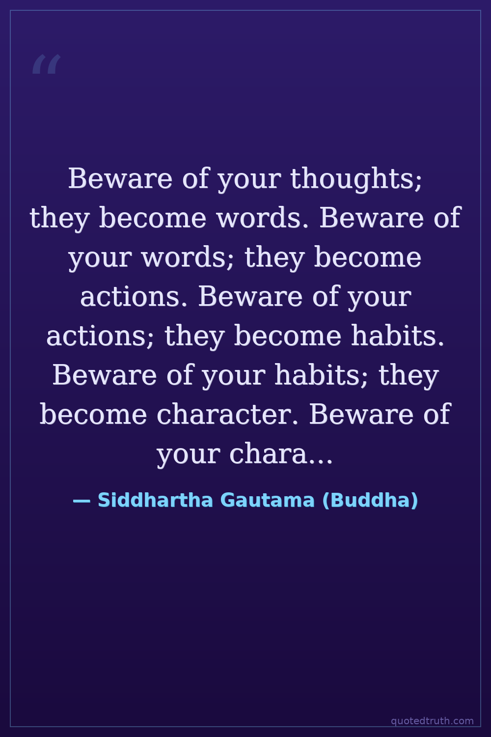 Beware of your thoughts; they become words. Beware of your words; they become actions. Beware of your actions; they become habits. Beware of your habits; they become character. Beware of your character; it becomes your destiny.