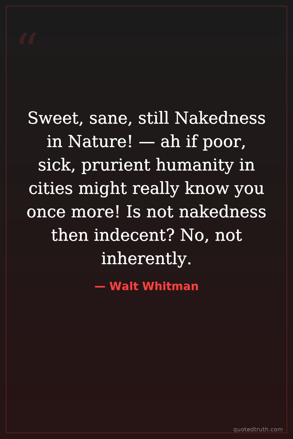 Sweet, sane, still Nakedness in Nature! — ah if poor, sick, prurient humanity in cities might really know you once more! Is not nakedness then indecent? No, not inherently.