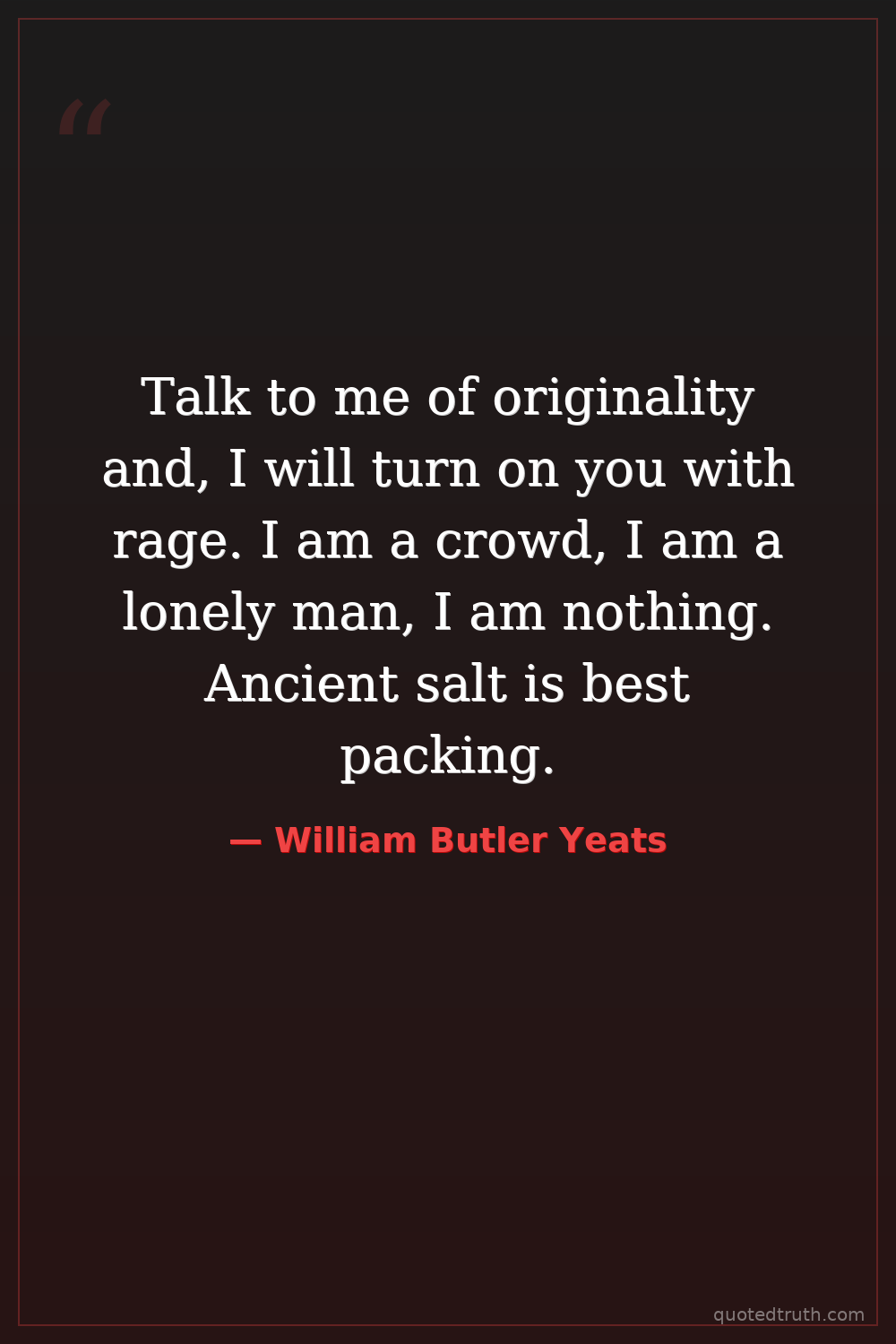 Talk to me of originality and, I will turn on you with rage. I am a crowd, I am a lonely man, I am nothing. Ancient salt is best packing.