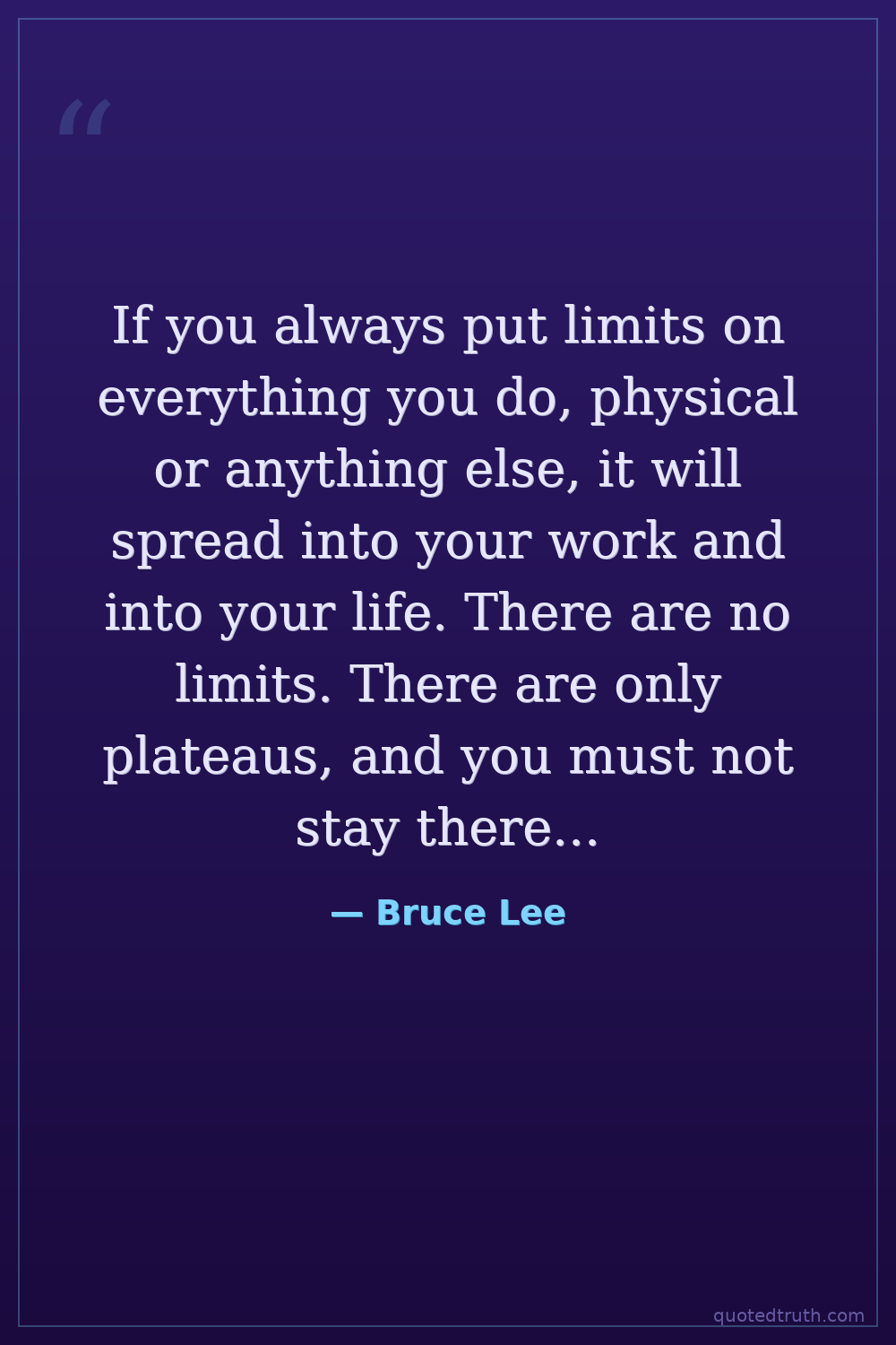 If you always put limits on everything you do, physical or anything else, it will spread into your work and into your life. There are no limits. There are only plateaus, and you must not stay there, you must go beyond them.