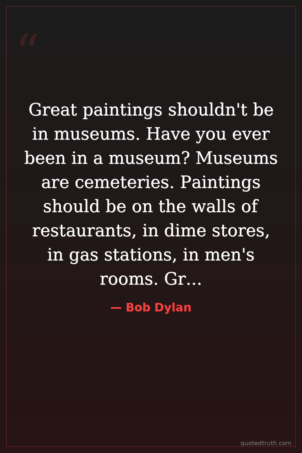 Great paintings shouldn't be in museums. Have you ever been in a museum? Museums are cemeteries. Paintings should be on the walls of restaurants, in dime stores, in gas stations, in men's rooms. Great paintings should be where people hang out. The only thing where it's happening is on radio and records, that's where people hang out. You can't see great paintings. You pay half a million and hang one in your house and one guest sees it. That's not art. That's a shame, a crime.