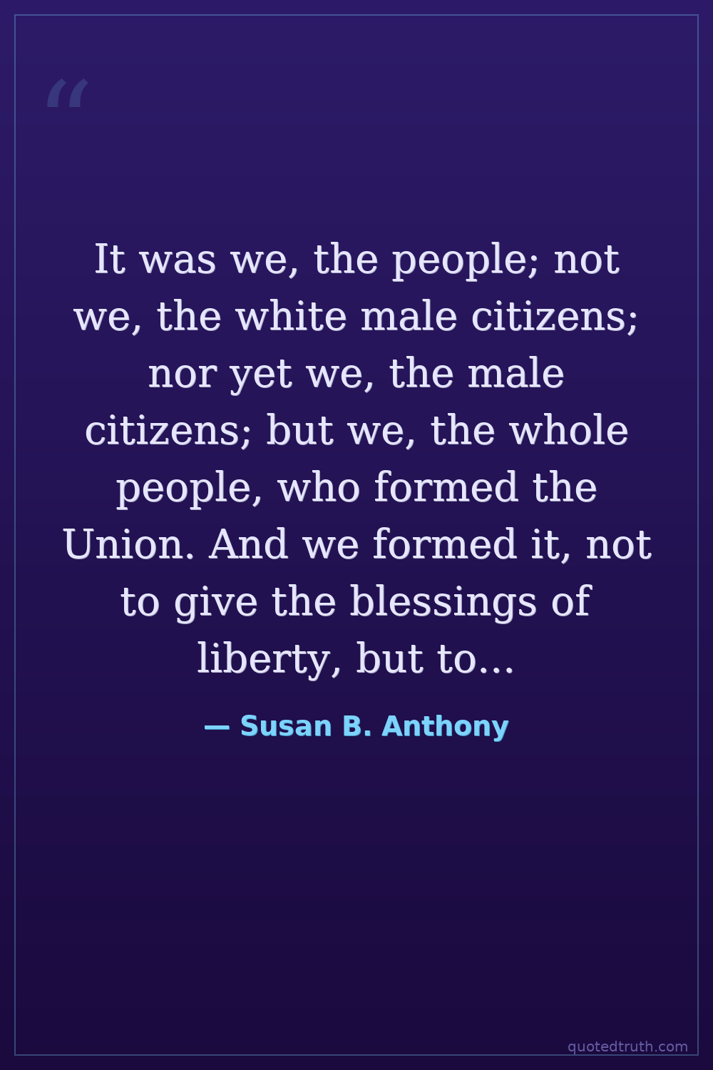 It was we, the people; not we, the white male citizens; nor yet we, the male citizens; but we, the whole people, who formed the Union. And we formed it, not to give the blessings of liberty, but to secure them; not to the half of ourselves and the half of our posterity, but to the whole people—women as well as men.