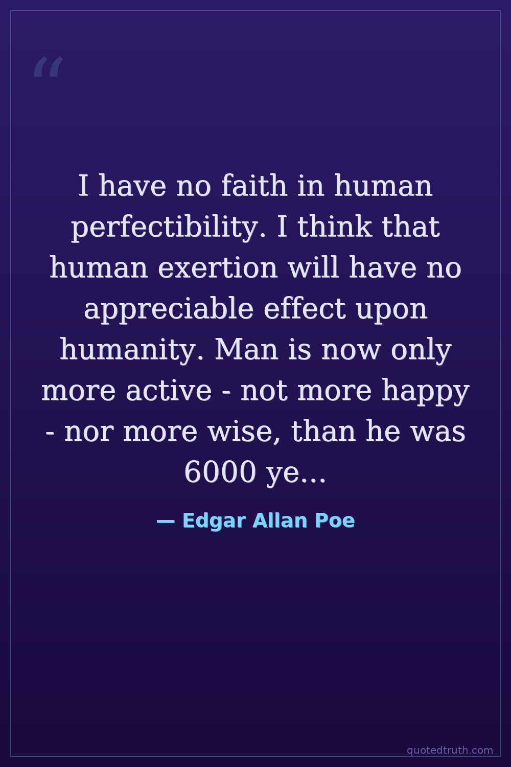 I have no faith in human perfectibility. I think that human exertion will have no appreciable effect upon humanity. Man is now only more active - not more happy - nor more wise, than he was 6000 years ago.