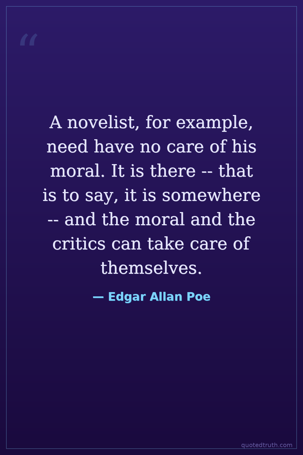A novelist, for example, need have no care of his moral. It is there -- that is to say, it is somewhere -- and the moral and the critics can take care of themselves.