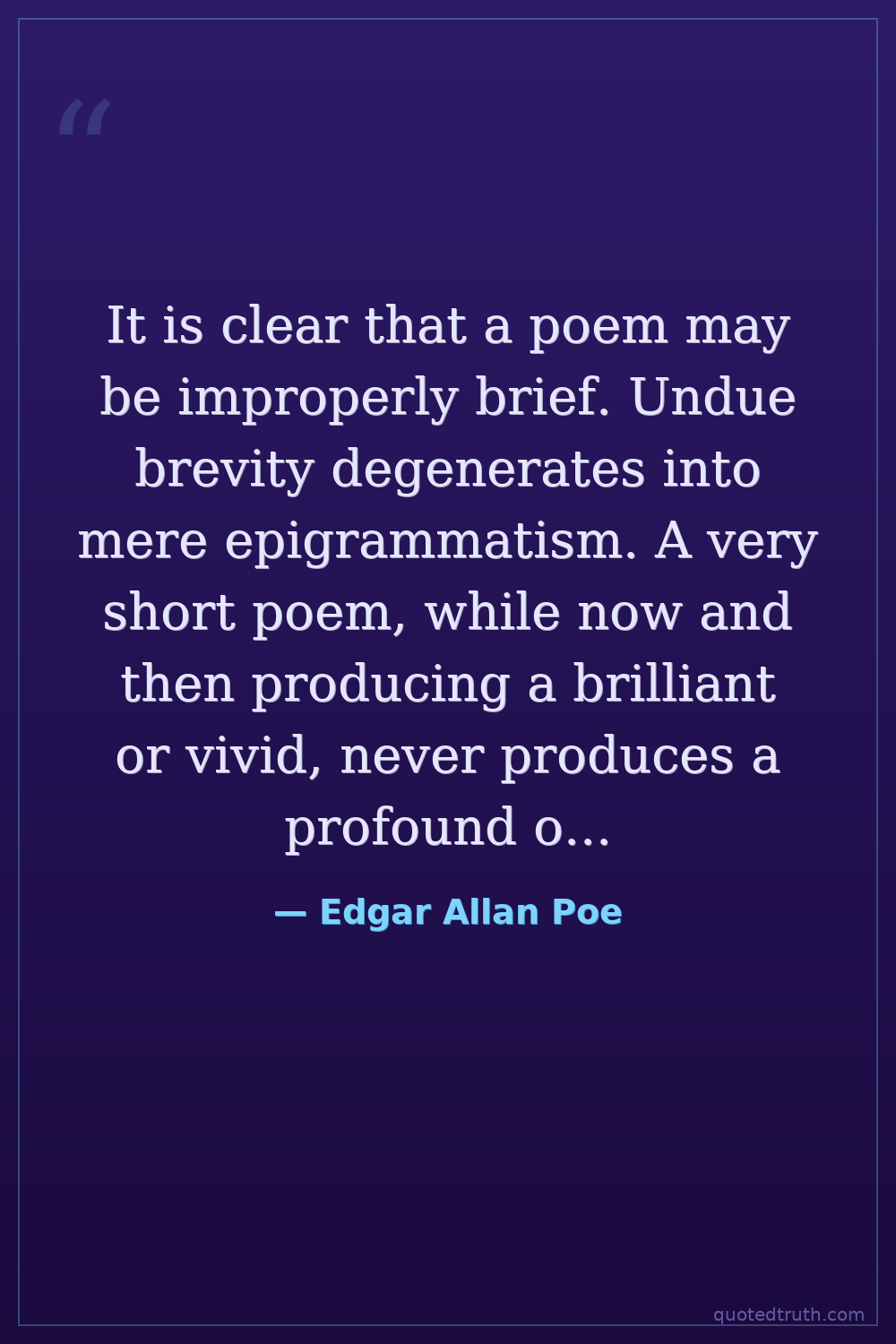 It is clear that a poem may be improperly brief. Undue brevity degenerates into mere epigrammatism. A very short poem, while now and then producing a brilliant or vivid, never produces a profound or enduring effect. There must be the steady pressing down of the stamp upon the wax.