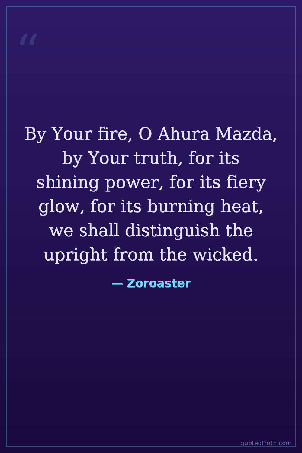 By Your fire, O Ahura Mazda, by Your truth, for its shining power, for its fiery glow, for its burning heat, we shall distinguish the upright from the wicked.