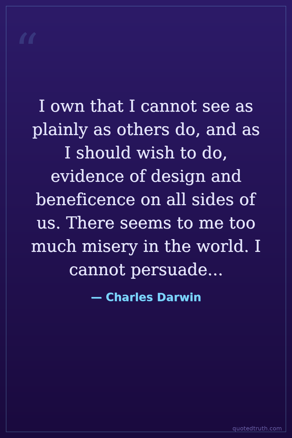 I own that I cannot see as plainly as others do, and as I should wish to do, evidence of design and beneficence on all sides of us. There seems to me too much misery in the world. I cannot persuade myself that a beneficent and omnipotent God would have designedly created the Ichneumonidæ with the express intention of their feeding within the living bodies of Caterpillars, or that a cat should play with mice... I feel most deeply that the whole subject is too profound for the human intellect.