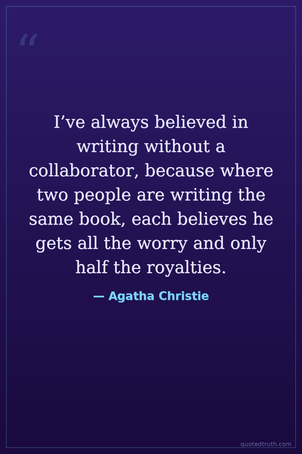 I’ve always believed in writing without a collaborator, because where two people are writing the same book, each believes he gets all the worry and only half the royalties.