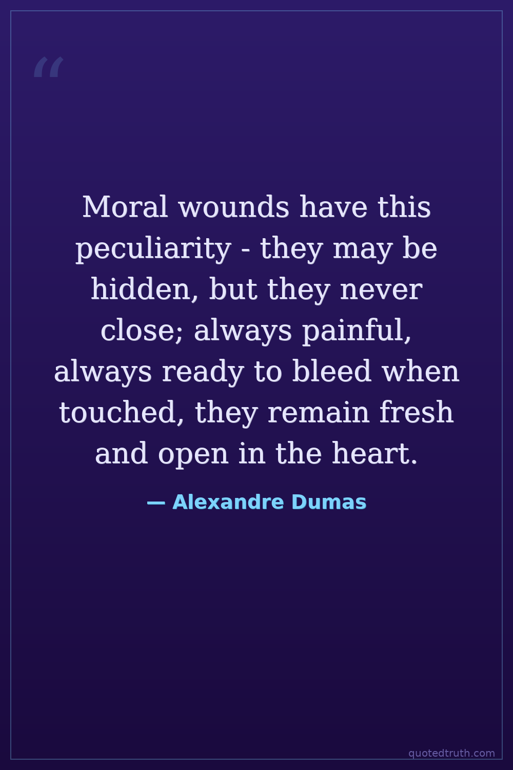 Moral wounds have this peculiarity - they may be hidden, but they never close; always painful, always ready to bleed when touched, they remain fresh and open in the heart.