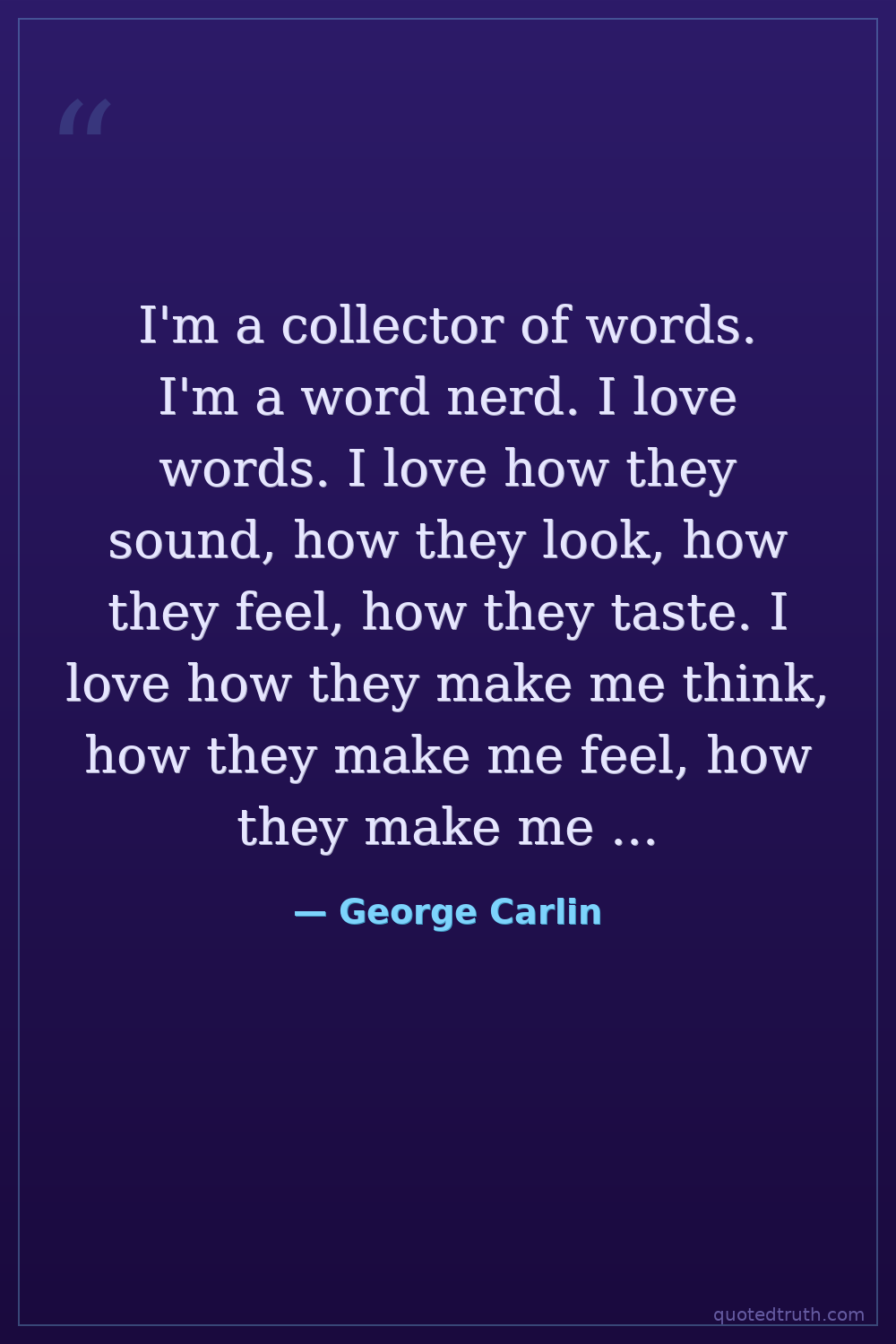 I'm a collector of words. I'm a word nerd. I love words. I love how they sound, how they look, how they feel, how they taste. I love how they make me think, how they make me feel, how they make me laugh, how they make me cry. I love how they make me understand, how they make me wonder, how they make me question. I love words.