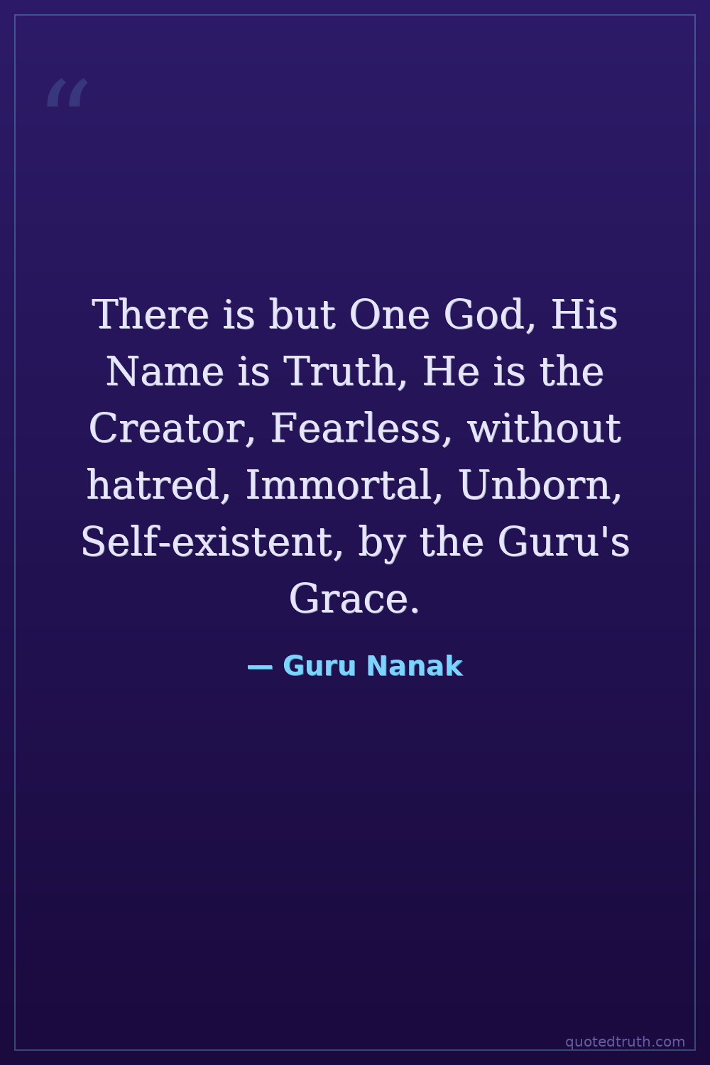 There is but One God, His Name is Truth, He is the Creator, Fearless, without hatred, Immortal, Unborn, Self-existent, by the Guru's Grace.