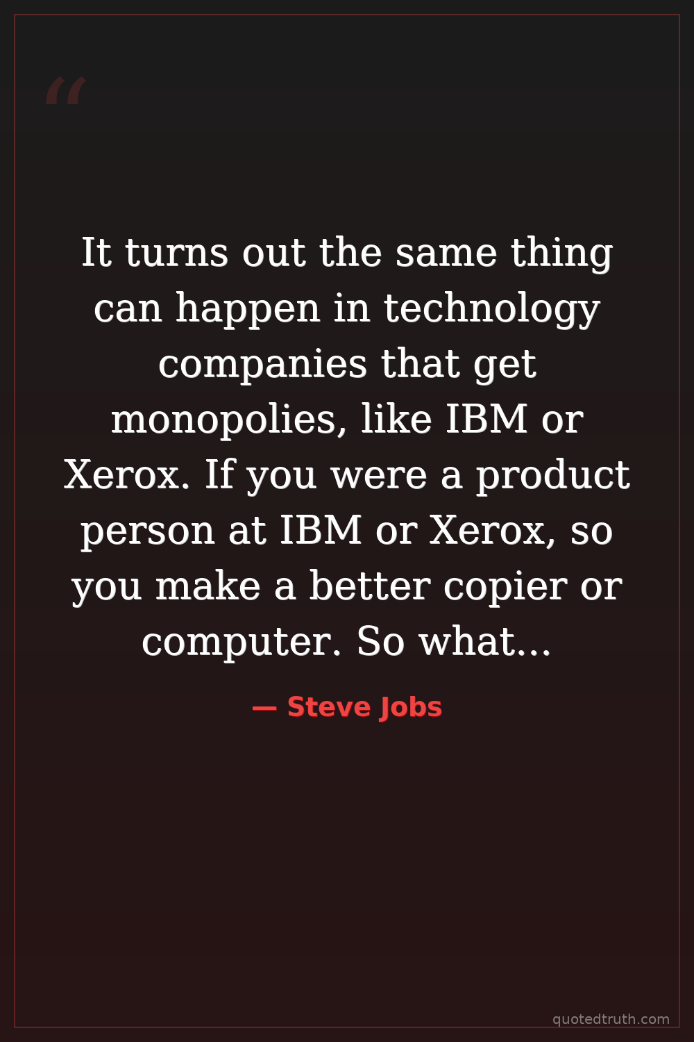 It turns out the same thing can happen in technology companies that get monopolies, like IBM or Xerox. If you were a product person at IBM or Xerox, so you make a better copier or computer. So what? When you have monopoly market share, the company's not any more successful. So the people that can make the company more successful are sales and marketing people, and they end up running the companies. And the product people get driven out of the decision making forums, and the companies forget what it means to make great products.
