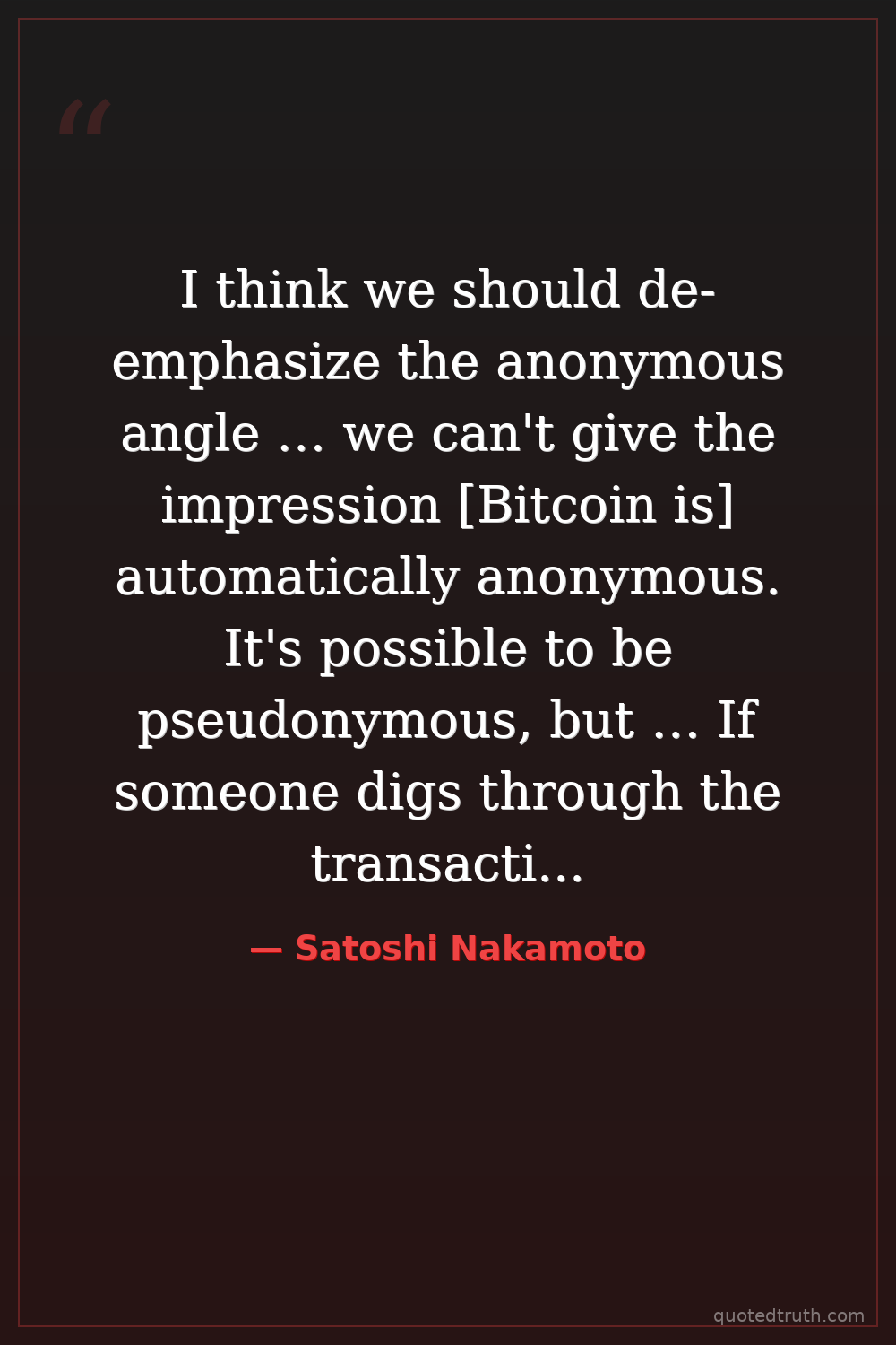 I think we should de-emphasize the anonymous angle … we can't give the impression [Bitcoin is] automatically anonymous. It's possible to be pseudonymous, but … If someone digs through the transaction history and starts exposing information people thought was anonymous, the backlash will be much worse if we haven't prepared expectations …