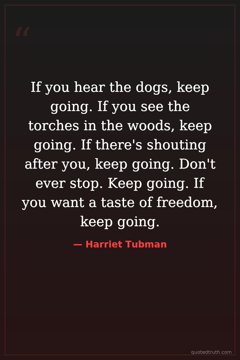 If you hear the dogs, keep going. If you see the torches in the woods, keep going. If there's shouting after you, keep going. Don't ever stop. Keep going. If you want a taste of freedom, keep going.