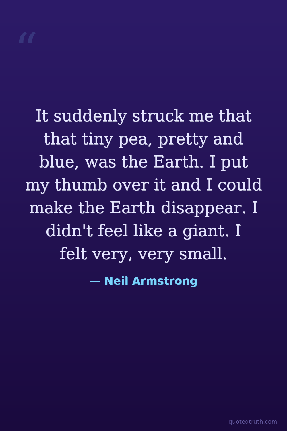 It suddenly struck me that that tiny pea, pretty and blue, was the Earth. I put my thumb over it and I could make the Earth disappear. I didn't feel like a giant. I felt very, very small.