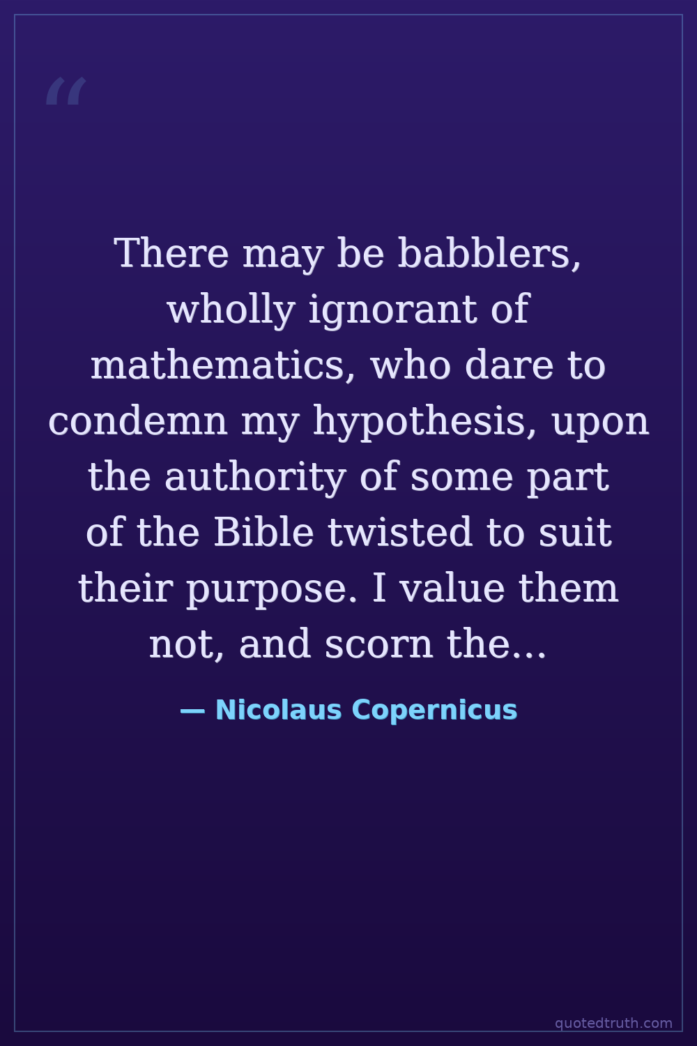 There may be babblers, wholly ignorant of mathematics, who dare to condemn my hypothesis, upon the authority of some part of the Bible twisted to suit their purpose. I value them not, and scorn their unfounded judgment.