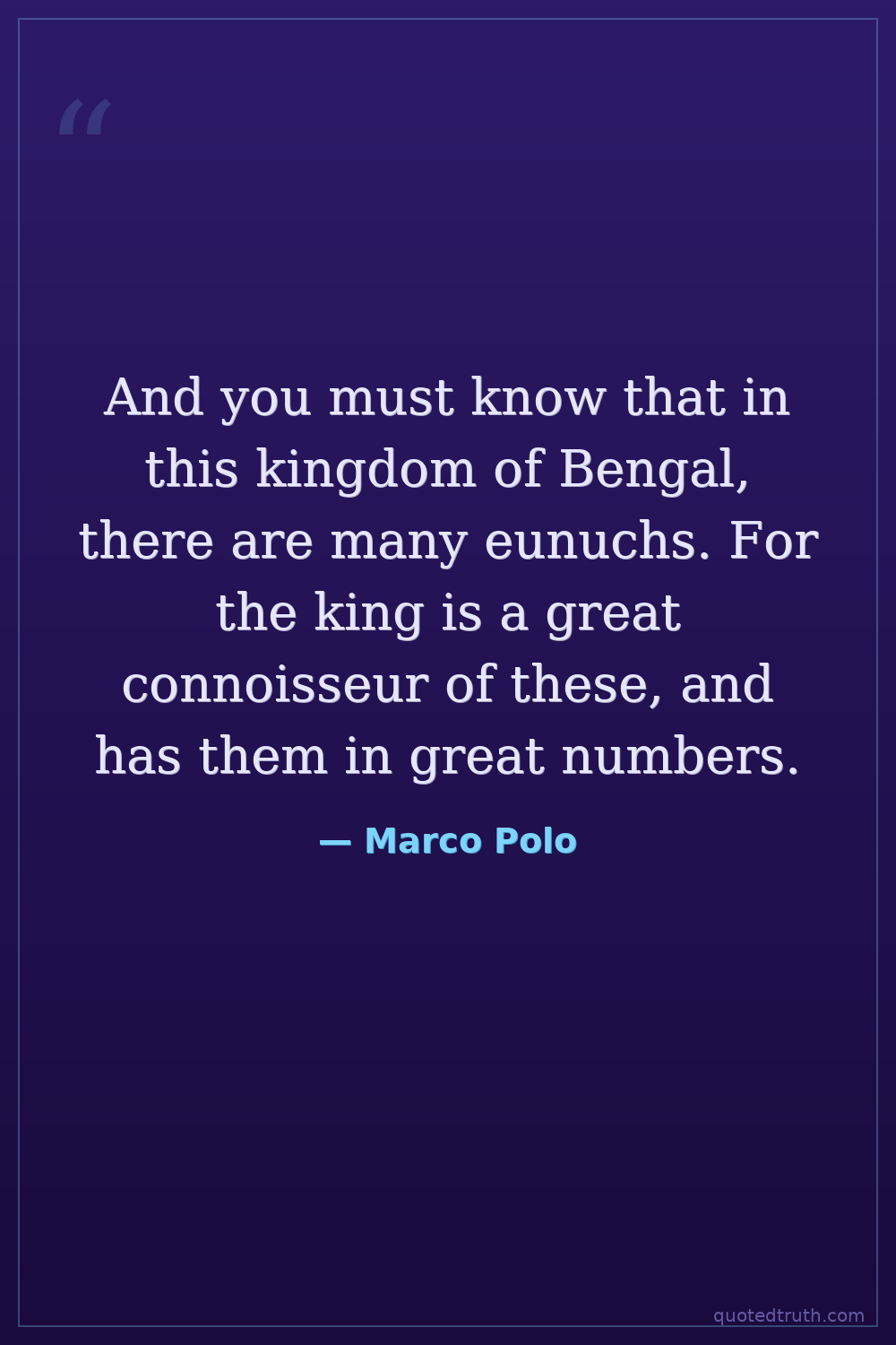 And you must know that in this kingdom of Bengal, there are many eunuchs. For the king is a great connoisseur of these, and has them in great numbers.