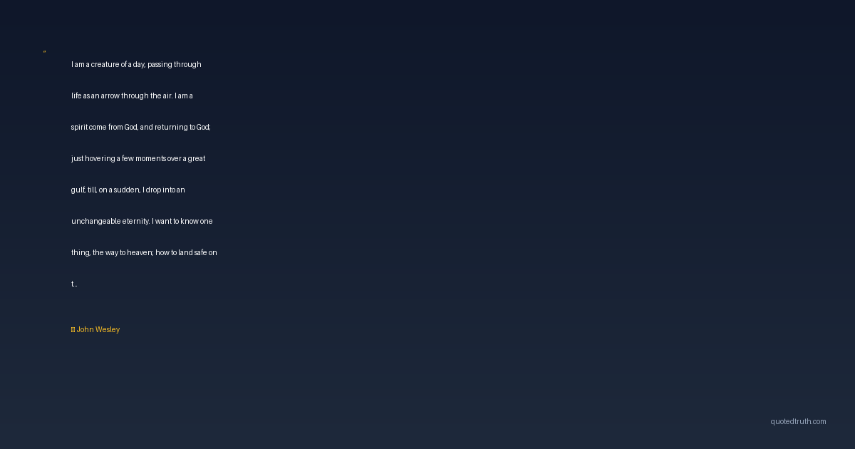 I am a creature of a day, passing through life as an arrow through the air. I am a spirit come from God, and returning to God; just hovering a few moments over a great gulf, till, on a sudden, I drop into an unchangeable eternity. I want to know one thing, the way to heaven; how to land safe on that happy shore. God Himself has condescended to teach the way; for this very end He came from heaven. He hath written it down in a book. O give me that book! At any price give me the Book of God! I have it: here is knowledge enough for me. Let me be homo unius libri.