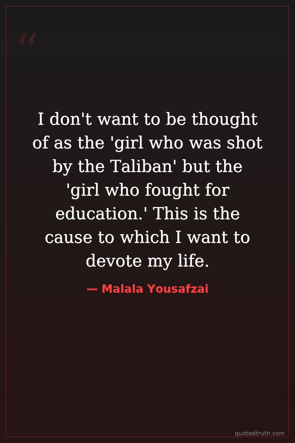 I don't want to be thought of as the 'girl who was shot by the Taliban' but the 'girl who fought for education.' This is the cause to which I want to devote my life.