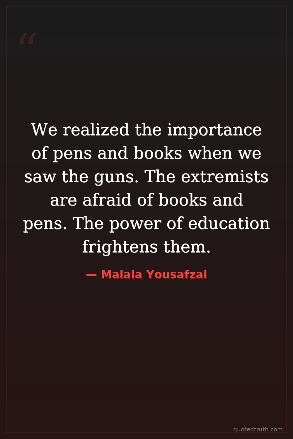 We realized the importance of pens and books when we saw the guns. The extremists are afraid of books and pens. The power of education frightens them.