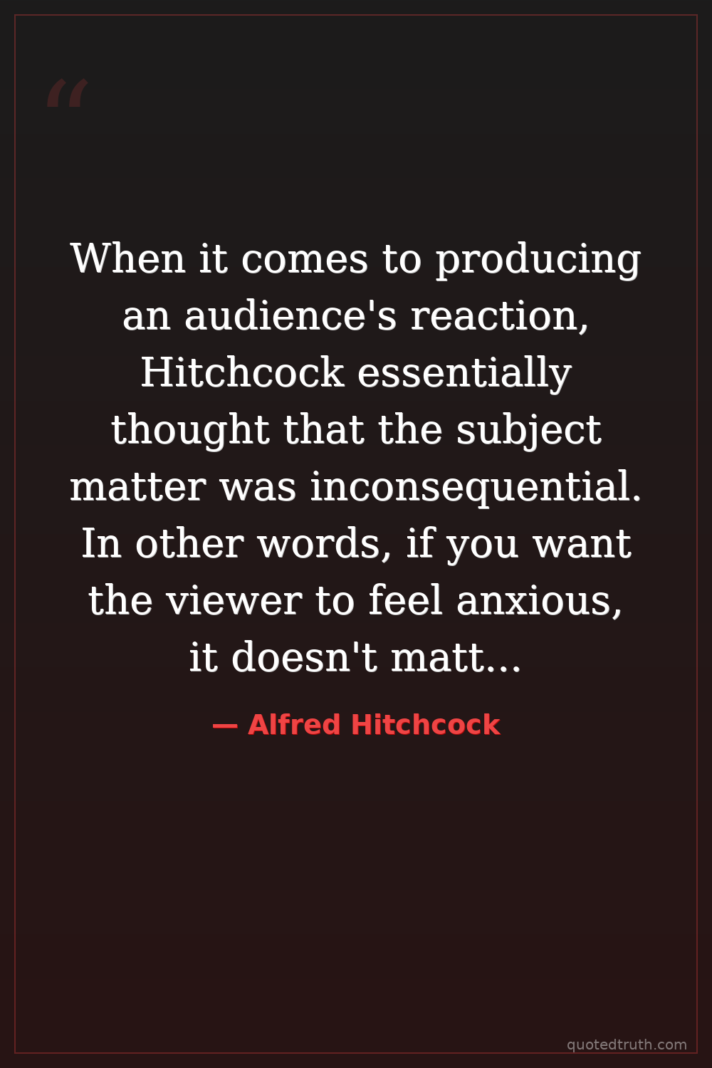 When it comes to producing an audience's reaction, Hitchcock essentially thought that the subject matter was inconsequential. In other words, if you want the viewer to feel anxious, it doesn't matter what the subject matter is as long as it's shot and edited in a certain way.