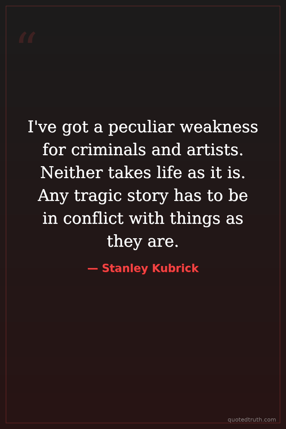 I've got a peculiar weakness for criminals and artists. Neither takes life as it is. Any tragic story has to be in conflict with things as they are.