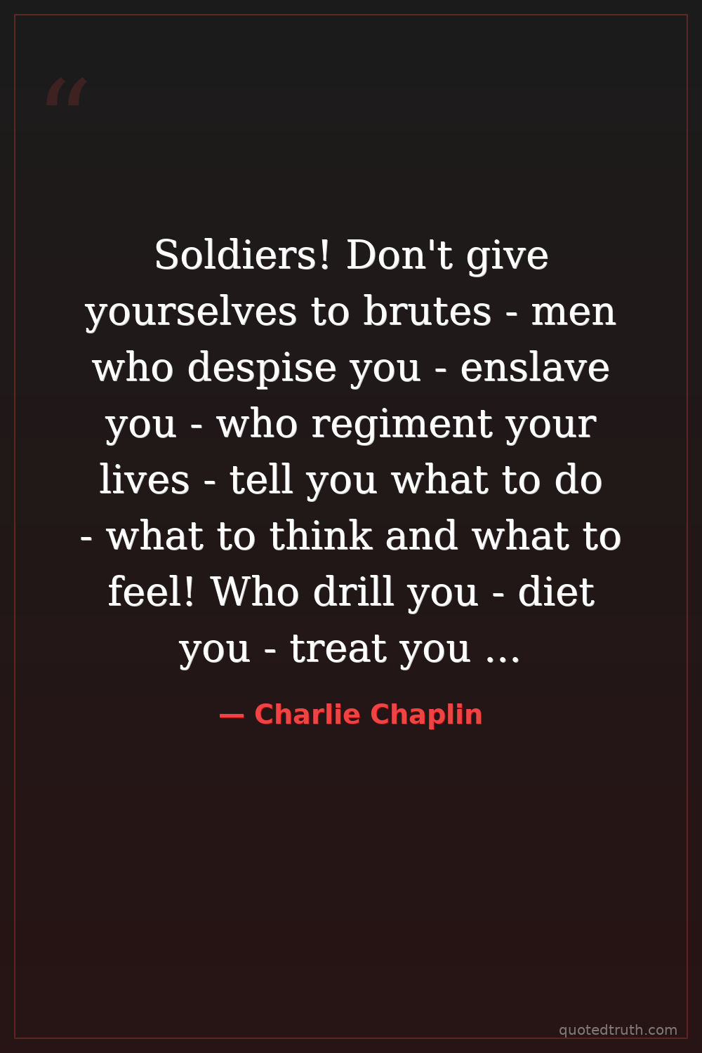 Soldiers! Don't give yourselves to brutes - men who despise you - enslave you - who regiment your lives - tell you what to do - what to think and what to feel! Who drill you - diet you - treat you like cattle, use you as cannon fodder.