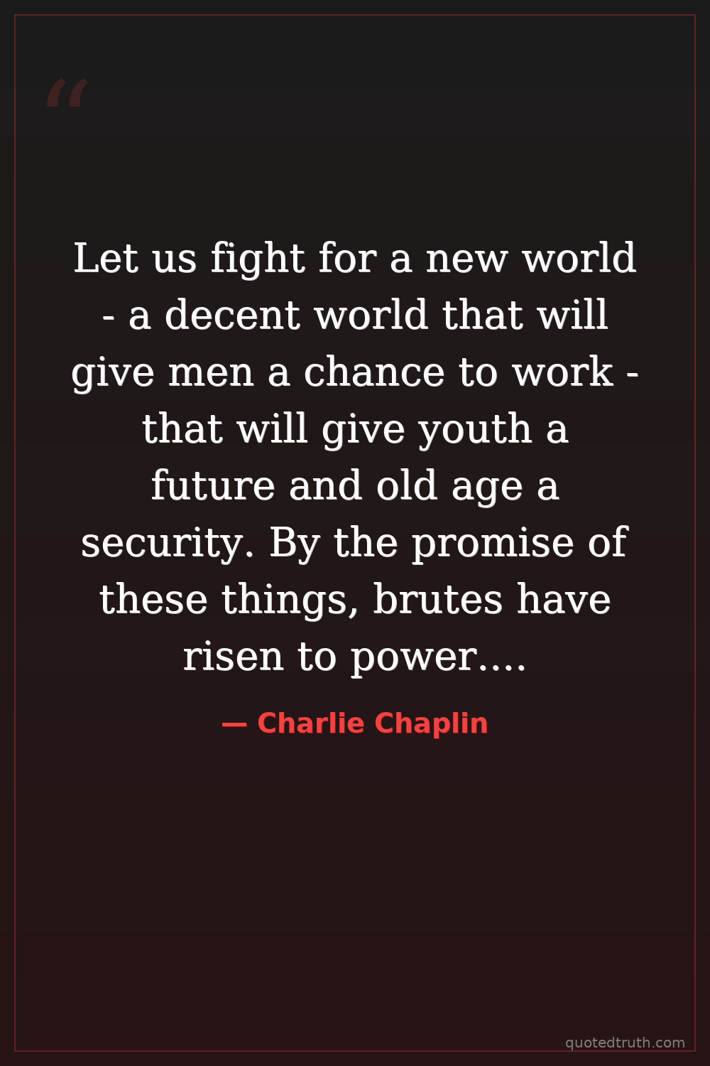 Let us fight for a new world - a decent world that will give men a chance to work - that will give youth a future and old age a security. By the promise of these things, brutes have risen to power. But they lie! They do not fulfil that promise. They never will! Dictators free themselves but they enslave the people!