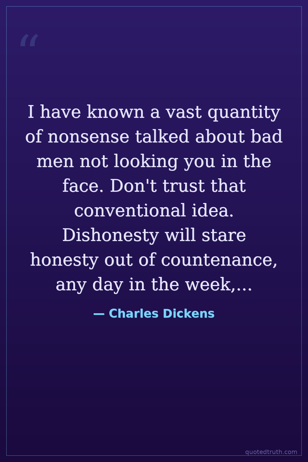 I have known a vast quantity of nonsense talked about bad men not looking you in the face. Don't trust that conventional idea. Dishonesty will stare honesty out of countenance, any day in the week, if there is anything to be got by it.